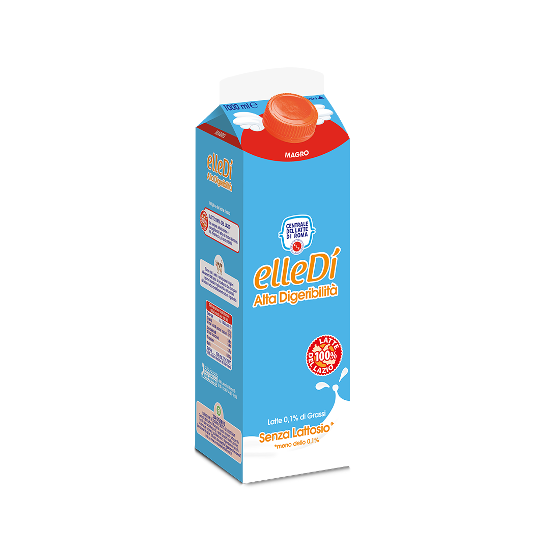 ElleDi` e` il latte della Centrale del Latte di Roma senza lattosio proviene da stalle selezionate del Lazio. Elledì scremato che potrai riconoscere dal colore rosso che circonda il tappo è con 0,1 % di grassi. Un latte pastorizzato altamente digeribile, pensato per gli intolleranti al lattosio, e` ideale per chi sceglie leggerezza e digeribilità. Il latte ElleDi` contiene meno dello 0,1% di lattosio perche` quasi tutto viene scisso nei suoi componenti glucosio e galattosio piu` facilmente assimilabili.